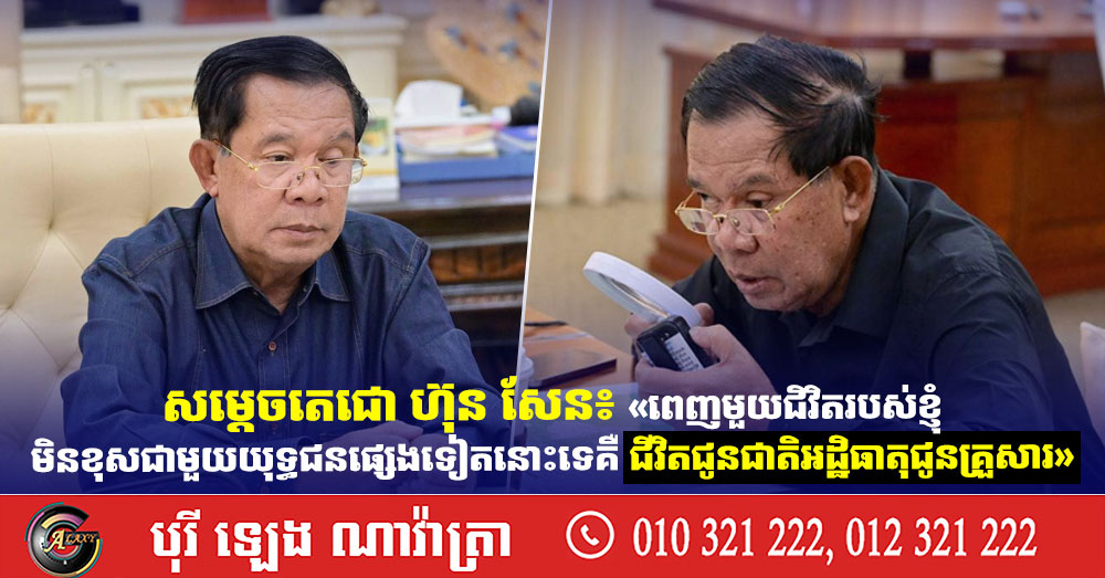 (ភ្នំពេញ)៖ សម្តេចតេជោ ហ៊ុន សែន ប្រធានព្រឹទ្ធសភាកម្ពុជា បានថ្លែងសារតាមបណ្តាញសង្គមនៅរសៀលថ្ងៃទី២៧ ខែកក្កដា ឆ្នាំ២០២៥នេះថា ពេញមួយជិវិតរបស់សម្តេច មិនខុសជាមួយយុទ្ធជនផ្សេងទៀតនោះទេគឺ «ជិវិតជូនជាតិអដ្ឋិធាតុជូនគ្រួសារ»។