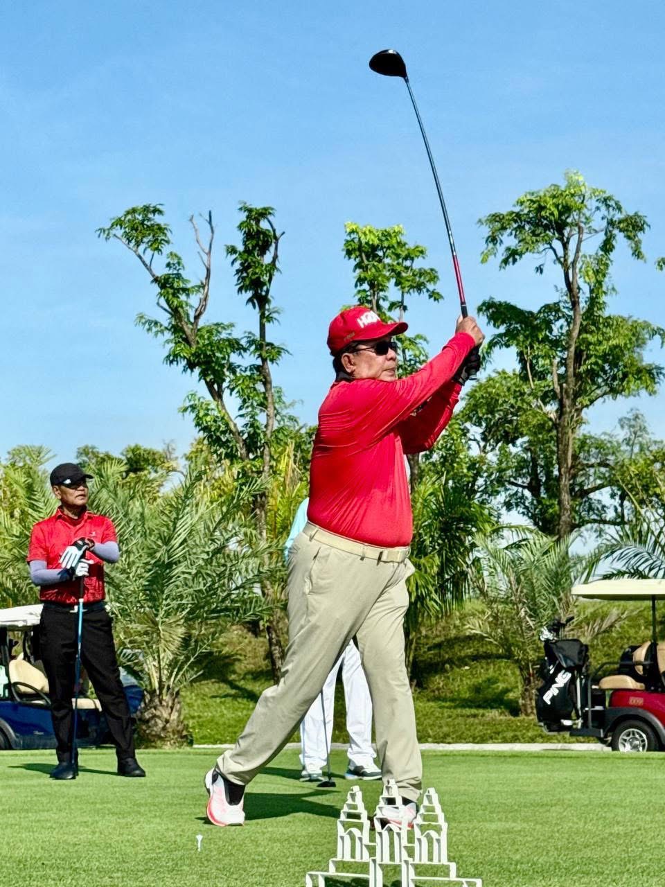 សម្តេចតេជោ បានបញ្ជាក់ថា ព្រឹកនេះឆ្លៀតមកវាយកូនគោលជាមួយដៃគូប្រកួតទាំងអ្នកអត់ធ្មេញទាំងអ្នកពូកែលេងខូច។ សម្តេចតេជោ បានគូសរំលេចដែរថា អង្គុយរាប់រយម៉ោងធ្វើឱ្យចង្កេះរឹងបន្តិច តែវាយកូនគោលនៅតែល្អទាំង Driver wood lrons។