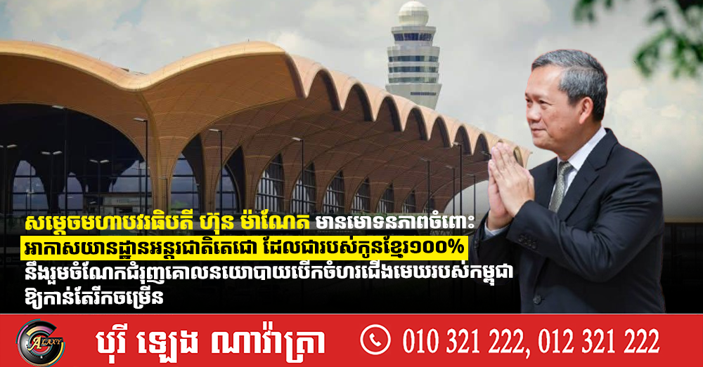 សម្ដេចមហាបវរធិបតី ហ៊ុន ម៉ាណែត មានមោទនភាពចំពោះ អាកាសយានដ្ឋានអន្ដរជាតិតេជោ ដែលជារបស់កូនខ្មែរ១០០% នឹងរួមចំណែកជំរុញគោលនយោបាយបើកចំហរជើងមេឃរបស់កម្ពុជាឱ្យកាន់តែរីកចម្រើន