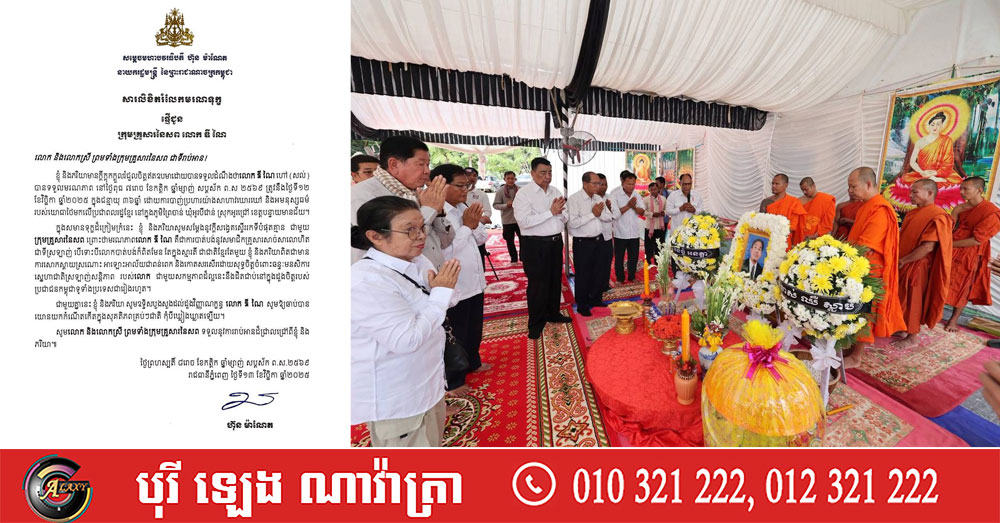 សម្ដេចបវរធិបតី ហ៊ុន ម៉ាណែត ផ្ញើសារលិខិតរំលែកមរណទុក្ខ ជូនក្រុមគ្រួសារនៃសពលោក ឌី ណៃ ដែលត្រូវយោធាថៃ បាញ់ប្រហារយ៉ាងសាហាវឃោរឃៅ នៅភូមិព្រៃចាន់