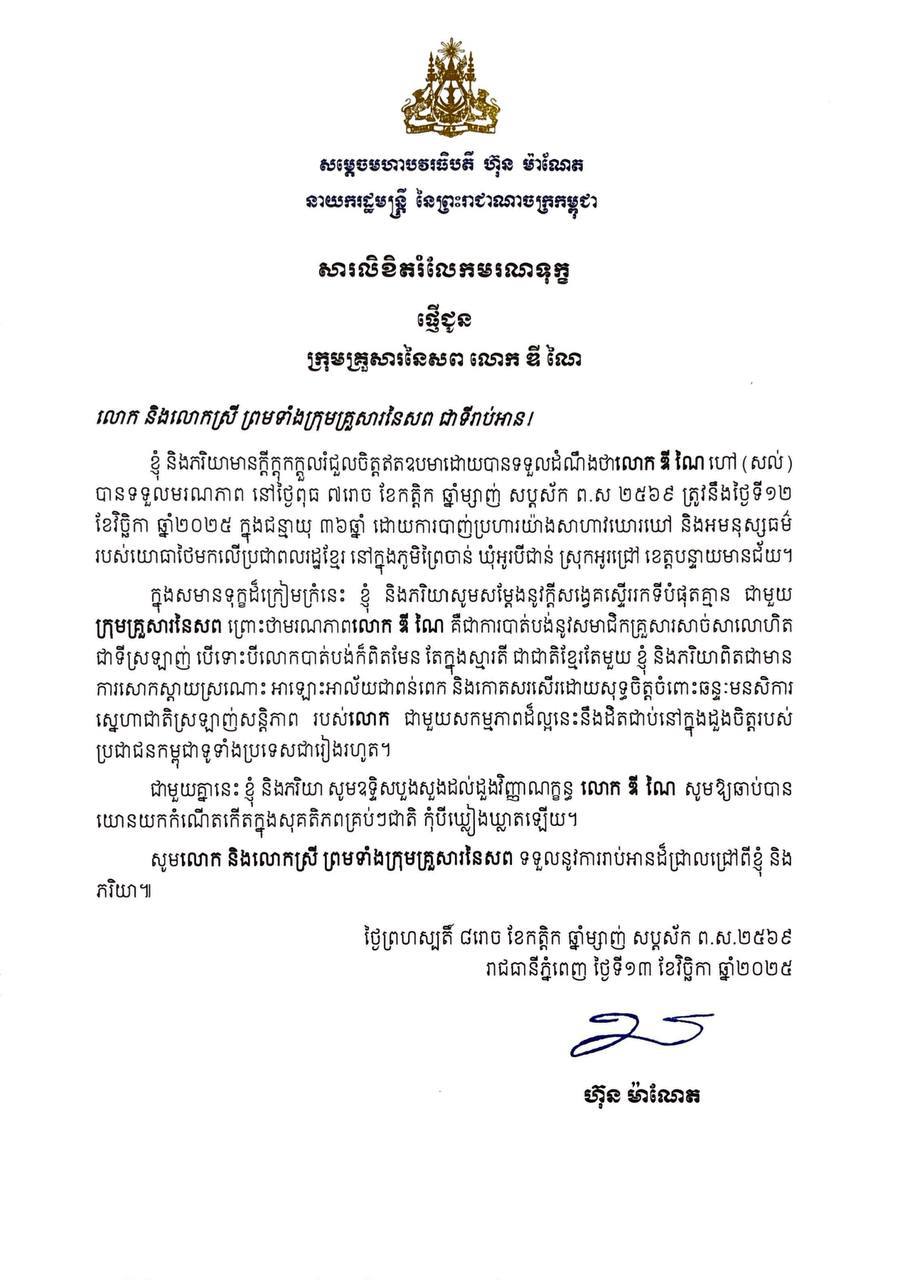 (ភ្នំពេញ)៖ សម្ដេចបវរធិបតី ហ៊ុន ម៉ាណែត នាយករដ្ឋមន្ដ្រីនៃកម្ពុជា បានផ្ញើសារលិខិតរំលែកមរណទុក្ខ ជូនក្រុមគ្រួសារនៃសព របស់លោក ឌី ណៃ ដែលបានទទួលមរណភាព នៅថ្ងៃទី១២ ខែវិច្ឆិកា ឆ្នាំ២០២៥ ក្នុងជន្មាយុ៣៦ឆ្នាំ ដោយការបាញ់ប្រហារយ៉ាងសាហាវឃោរឃៅ និងអមនុស្សធម៌ របស់យោធាថៃមកលើប្រជាពលរដ្ឋខ្មែរ នៅក្នុងភូមិព្រៃចាន់ ឃុំអូរបីជាន់ ស្រុកអូរជ្រៅ ខេត្តបន្ទាយមានជ័យ។